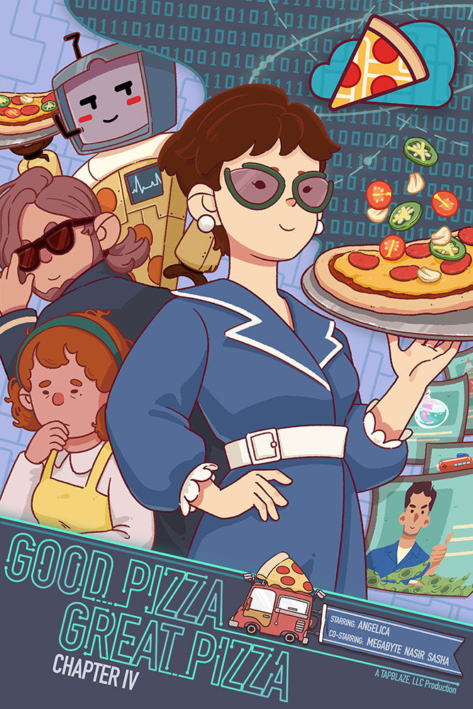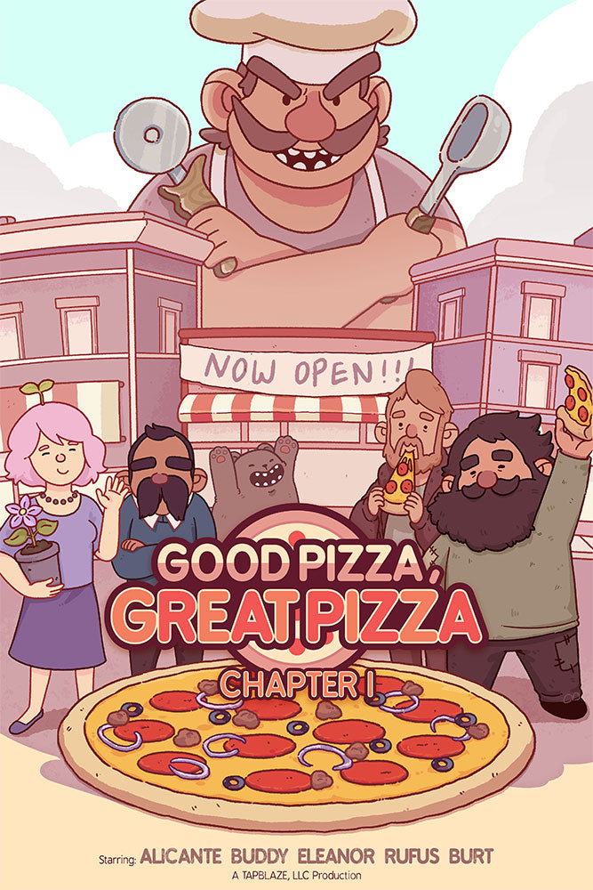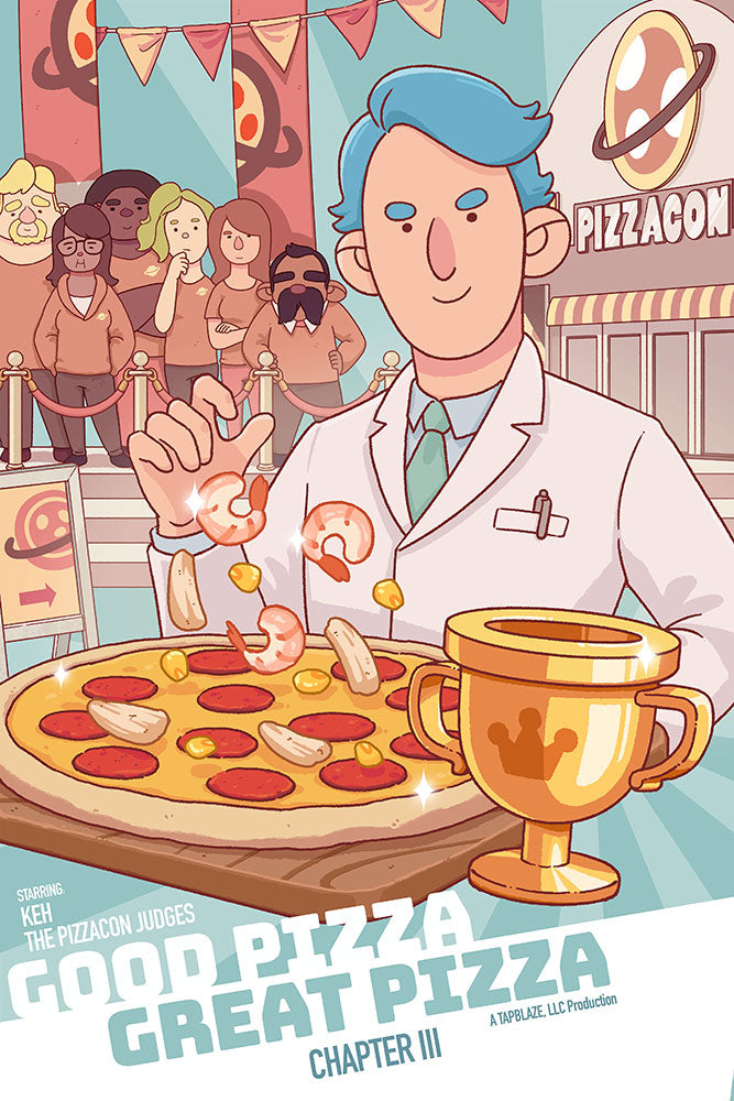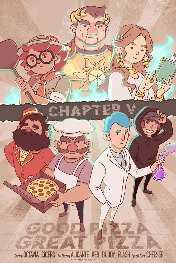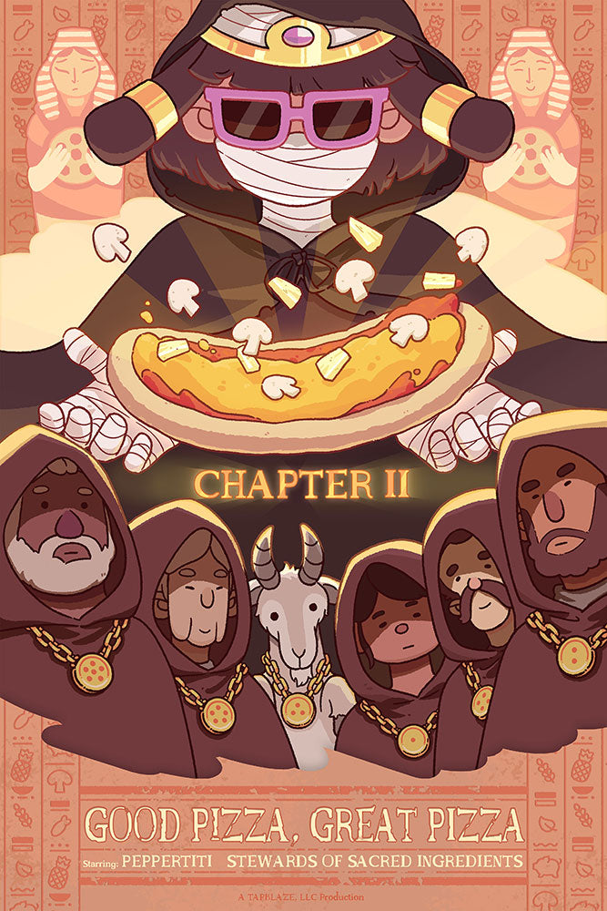 Celebrate the story of Good Pizza, Great Pizza through five beautifully illustrated chapter posters! From the humble beginnings to the mysteries surrounding ZArena, now you can own a piece of pizza history. Printed on 12” x 18” semi-gloss paper, these posters bring the flavor of each chapter to life!
